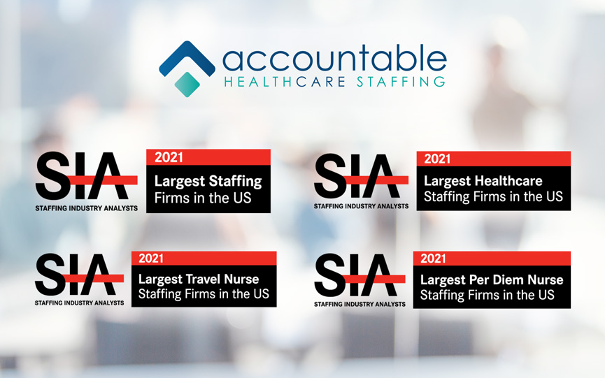 Accountable Healthcare Staffing, a national provider of temporary healthcare staffing services, proudly announces that Staffing Industry Analyst (SIA), the global advisors on staffing and workforce solutions, has named Accountable, to four of the Largest 2021 List. Accountable was honored to receive the Largest Staffing Firms, Largest Healthcare Staffing Firms, Largest Travel Nurse Firms, and Largest Per-Diem Firms recognition.