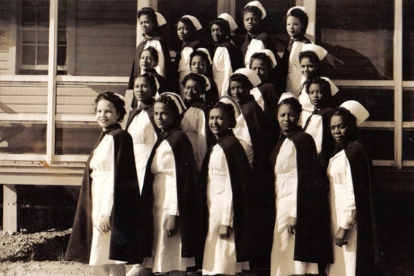 In November 1942, during World War II, the number of patients was increasing at the Oteen Veteran’s Administration Hospital. For that reason the Department of Veterans Affairs transferred nine African American nurses from Tuskegee U.S. Veterans Hospital 91 in Alabama to Oteen. By January 1943, an additional four nurses joined them. The Tuskegee hospital, founded in 1923, operated with black staff for black patients. Both Tuskegee and Oteen veteran hospitals concentrated on tuberculosis and mental health. The transferred nurses would work with African American patients. Ten of the nurses had worked over ten years at the Tuskegee hospital. All of the nurses had been trained at nursing schools and in hospitals across the eastern United States. Head nurse Elsie V. Davis was trained and worked at Michigan’s Battle Creek Sanitarium in 1920. Others received training at Grady Hospital in Atlanta, Freedman’s Hospital in Washington D.C., and the Lincoln School of Nursing in New York City among others.